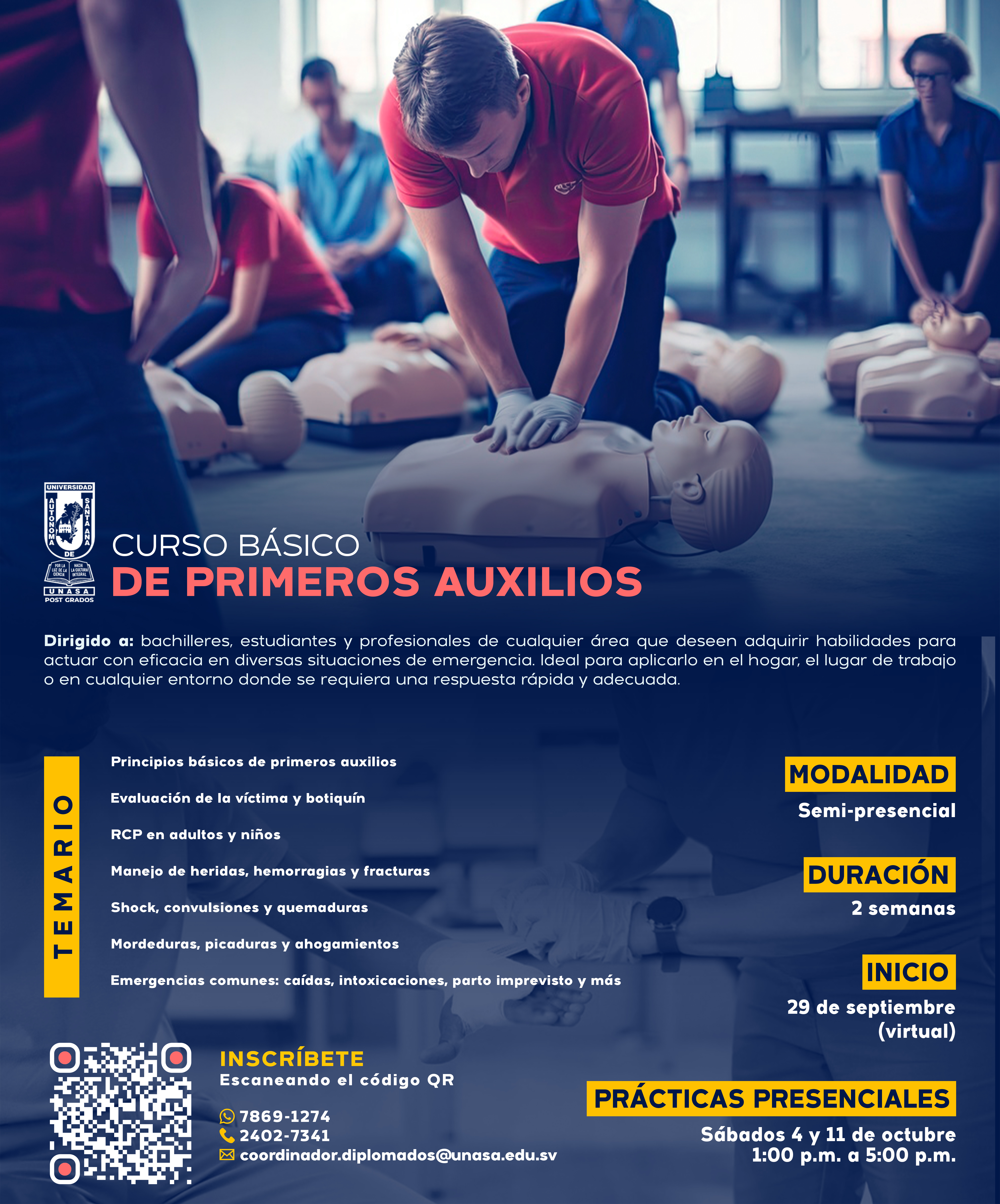 En situaciones de emergencia, cada segundo cuenta. Con el Curso Básico de Primeros Auxilios aprenderás las técnicas esenciales para actuar con rapidez, seguridad y confianza, convirtiéndote en un recurso valioso en tu comunidad, familia o lugar de trabajo. En solo 2 semanas dominarás procedimientos clave para brindar atención inmediata y eficaz antes de la llegada de los servicios médicos especializados.